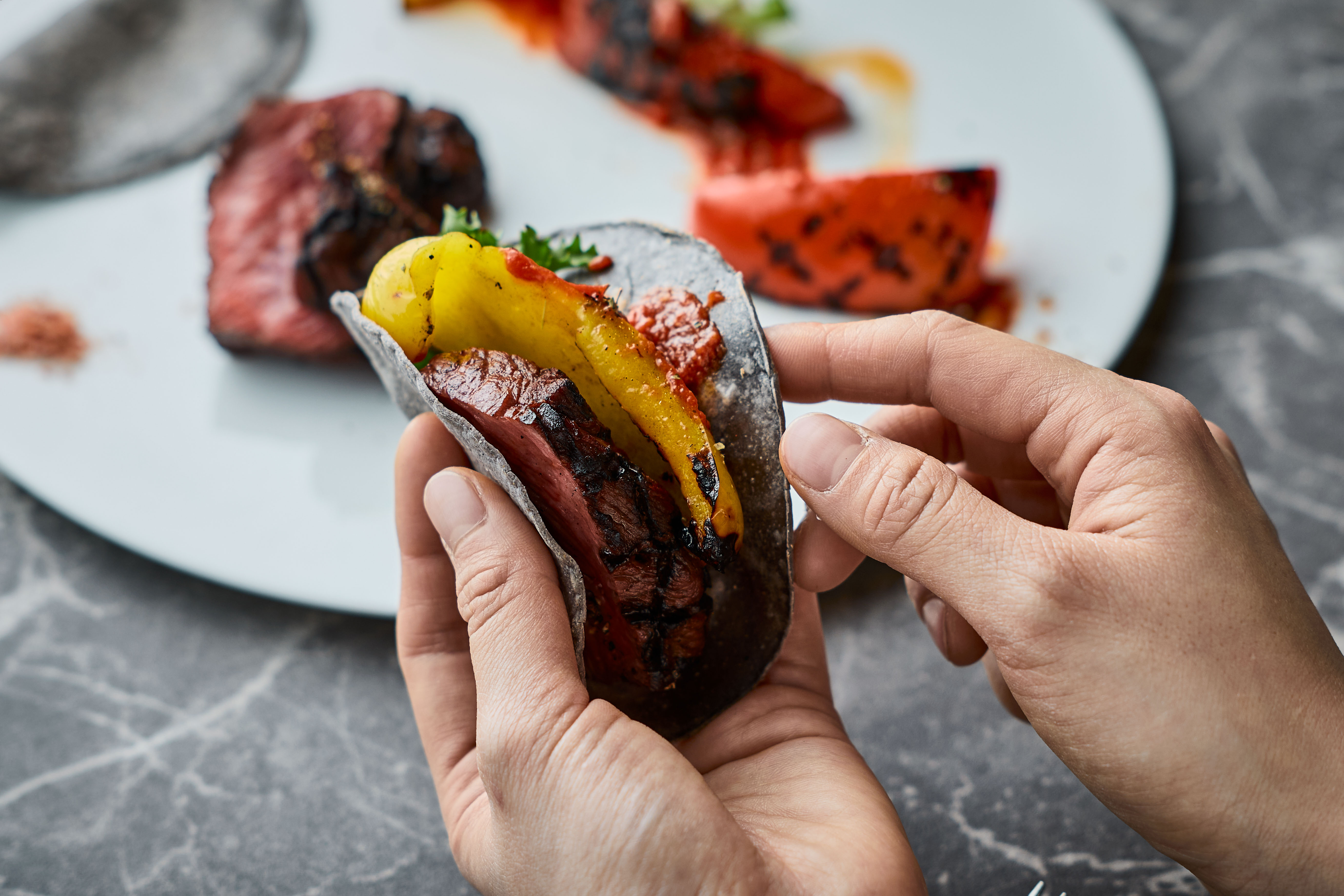熟成葉山牛のロティ プリンセスパプリカ🄬極甘のラタトュイユ 自家製ブルーコーンのトルティーヤ